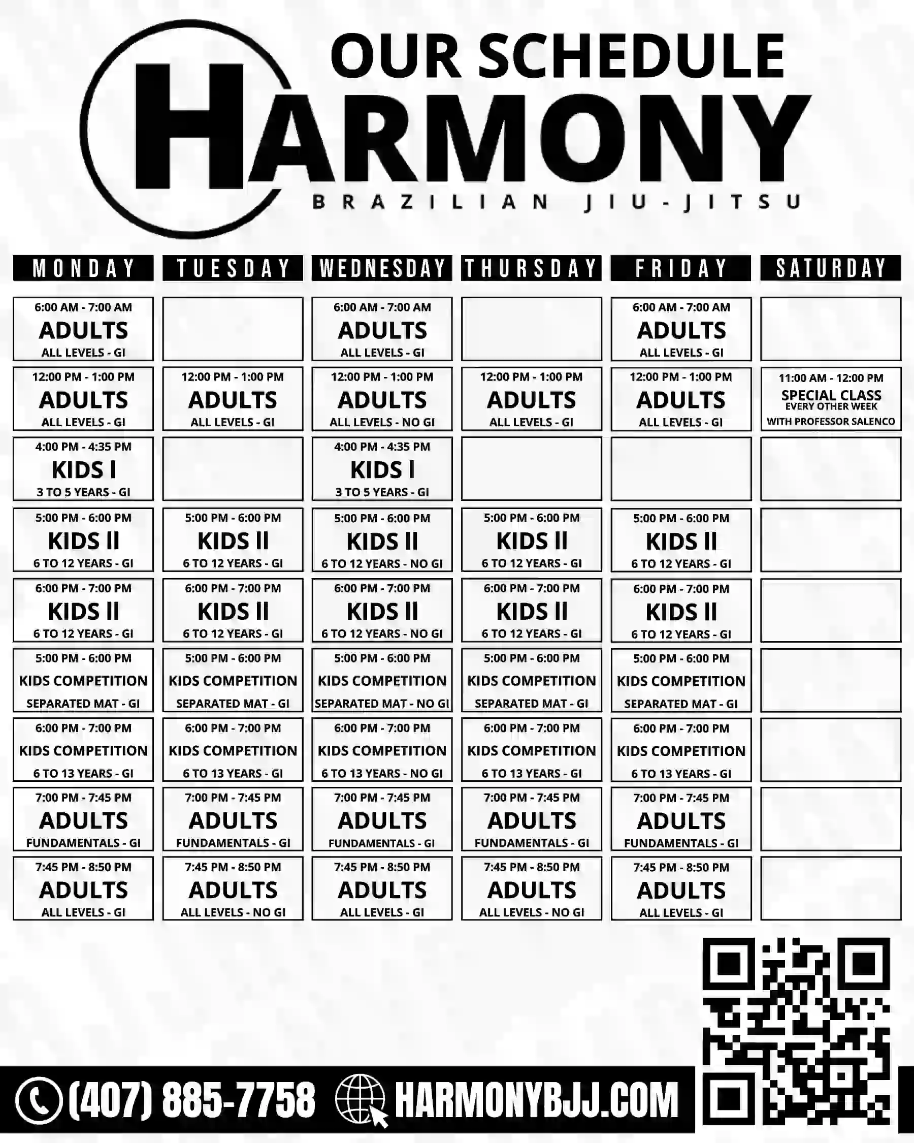 We understand life can get busy, but with our flexible schedule, you can easily find a time that fits into your daily routine and your family’s as well. Whether you’re looking to embark on your own Jiu-Jitsu journey or introduce your child to the art, we offer a variety of class times that perfectly accommodate any schedule. Take the opportunity to schedule a class at Harmony Bjj, the ideal place to grow, learn, and develop in a safe and welcoming environment.